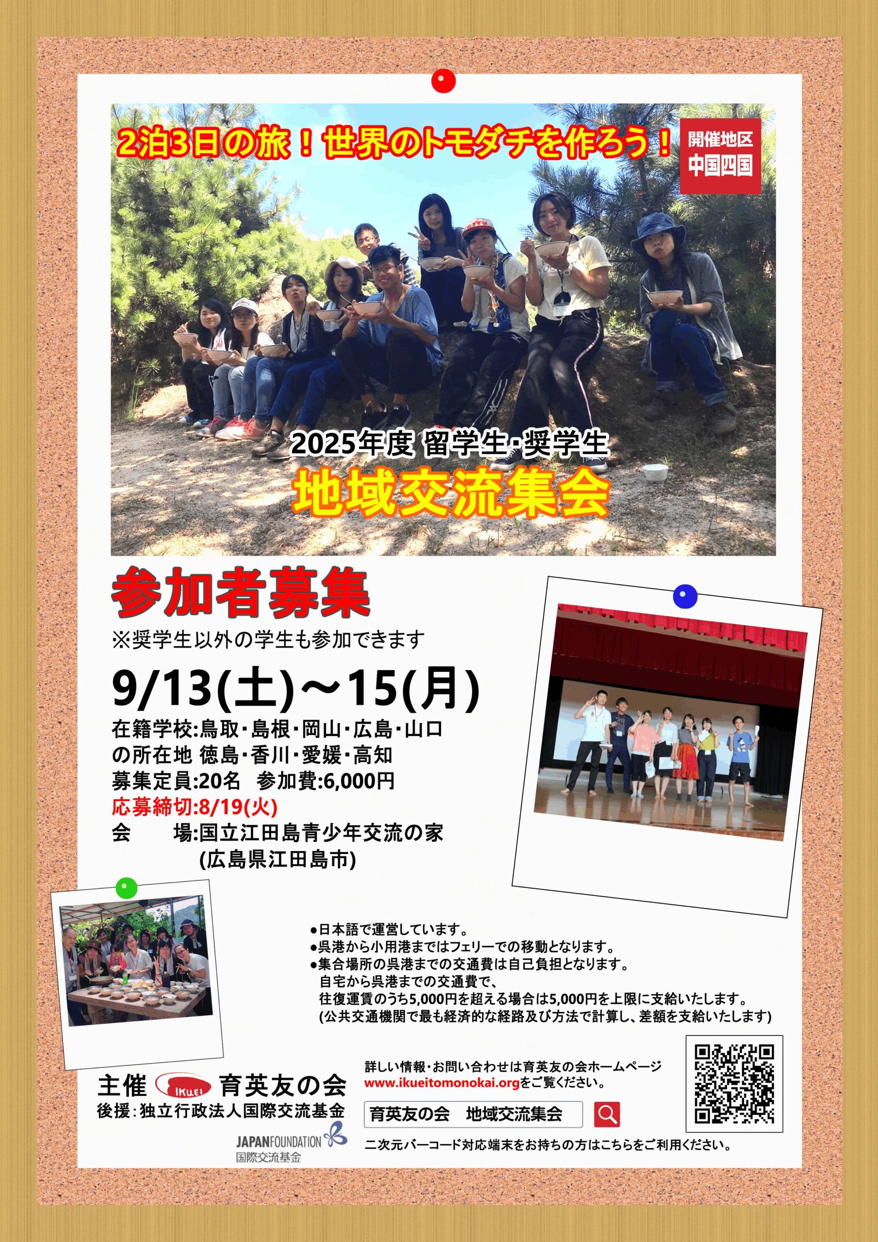 昨年度は、台風で中止となった、留学生・奨学生地域交流集会を今年度も実施します。今年度は、独立行政法人国際交流基金から後援をいただいています。