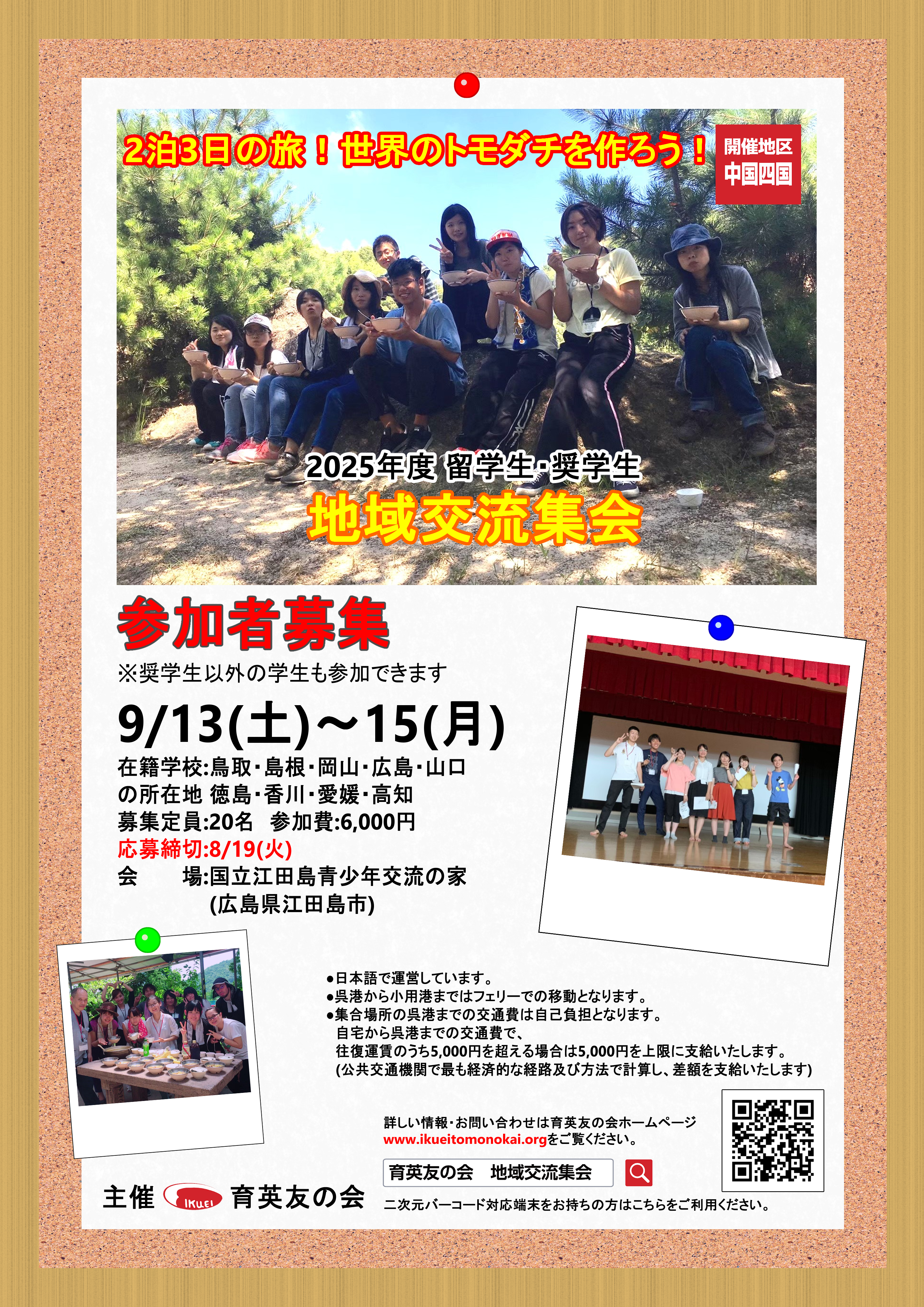 - 食費・宿泊費・行事費・保険料 は参加費に含まれています。自宅から集合場所(呉港)までの最も経済的な方法を使って算出した往復5,000円を超える分の交通費を支給します。(支給上限5,000円)